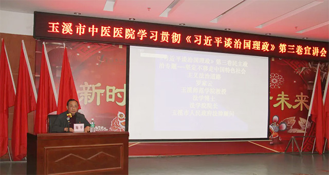 12月2日,玉溪市中醫(yī)醫(yī)院邀請玉溪師范學(xué)院法學(xué)院院長、羅家云教授到院開展學(xué)習(xí)貫徹黨的十九屆五中全會精神和《習(xí)近平談治國理政》第三卷宣講,全院黨員、入黨積極分子和非黨員的中層管理人員300余人參加了學(xué)習(xí)。