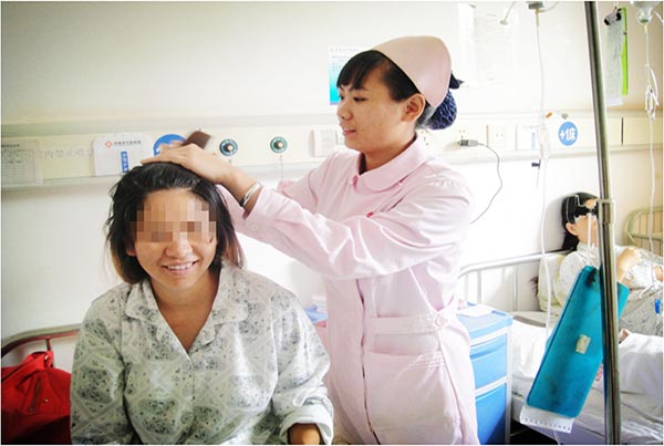 “阿姨,你的頭發(fā)亂了,我?guī)湍闶崾犷^。”張柔到病房時,沒有家屬陪伴的李阿姨剛剛做完手術(shù),即使是最簡單的梳頭都顯得很困難,張柔細心的為李阿姨梳起頭來。