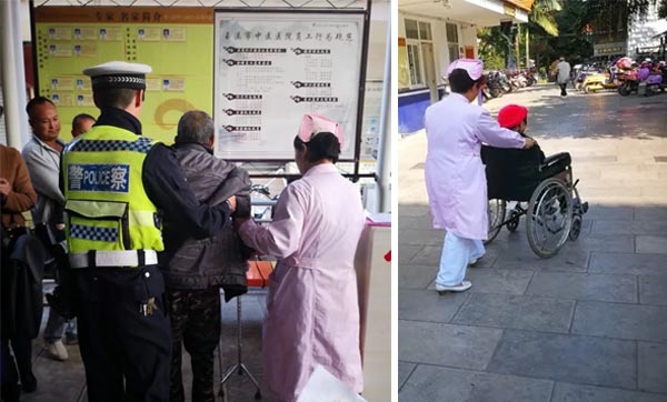 快退休的萬鳳瓊老師在門診微笑著,不厭其煩的指引一個又一個患者看病。她說她熱愛這份幫助人的工作。這位交警同志的背影同樣顯得溫暖而高達。