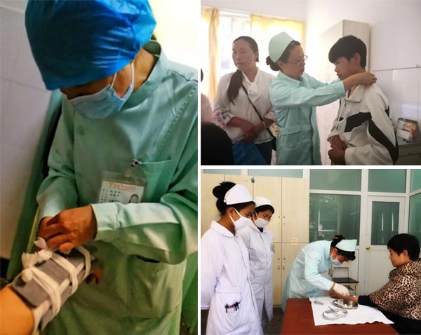 患者有序的進入治療室進行治療,這幾日天氣已經(jīng)很熱了,由于條件的限制,位于樓頂?shù)闹委熓绎@得更加悶熱, 普艷勤和鄭桐在為患者治療時,汗水不自覺的滑了下來…..盡管如此,龍霞還是耐心的向患者介紹治療的注意事項。