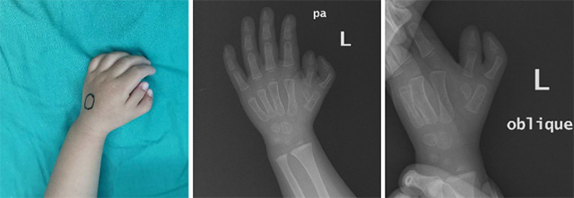 下圖為患兒2的術(shù)前手外觀及影像學(xué)資料