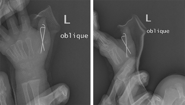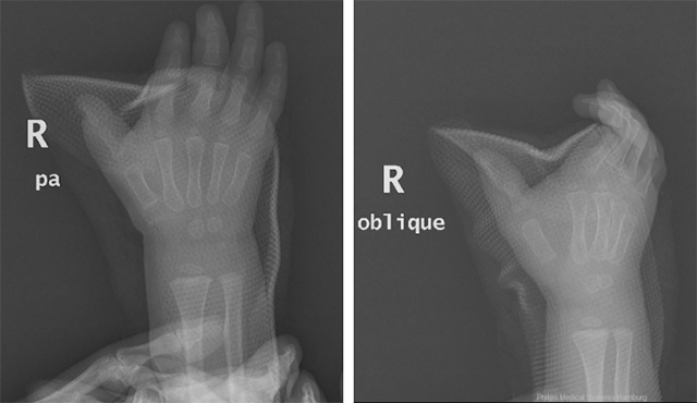 近期,玉溪市中醫(yī)醫(yī)院小兒骨科收治了兩名兒童蟹鉗樣復(fù)拇畸形的患兒。患兒分別為14個(gè)月大和20個(gè)月大,入院后小兒骨科針對(duì)患兒病情及時(shí)召開病歷討論專題會(huì),經(jīng)分析患兒相關(guān)查體及影象學(xué)檢查后考慮兩位患者分別為:先天性蟹鉗樣復(fù)拇畸形Wassel Ⅳ型和Ⅵ型 。