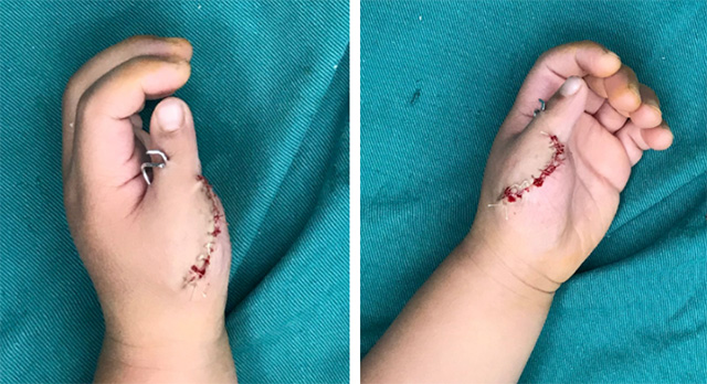 這是玉溪市中醫(yī)醫(yī)院完成的又一較為復(fù)雜的拇指多指畸形手術(shù),標(biāo)志著我院治療復(fù)雜多指畸形又邁上了一個(gè)新的臺(tái)階,目前多指(趾)畸形手術(shù)已經(jīng)在我院成熟開展,治療效果確切。