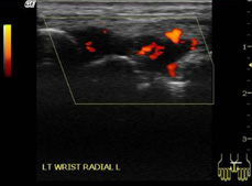 在類風(fēng)濕關(guān)節(jié)炎中,超聲在檢測關(guān)節(jié)炎癥方面優(yōu)于臨床檢查,可用于類風(fēng)濕關(guān)節(jié)炎與其他關(guān)節(jié)炎的鑒別診斷。即使滑膜炎處于臨床緩解期,超聲也能檢測出來??捎糜趤喤R床炎癥和治療反應(yīng)的評(píng)估。超聲檢查可發(fā)現(xiàn)滑膜炎、腱鞘炎和糜爛、積液、骨侵蝕的存在,預(yù)測關(guān)節(jié)損傷,并可用于評(píng)估預(yù)后。