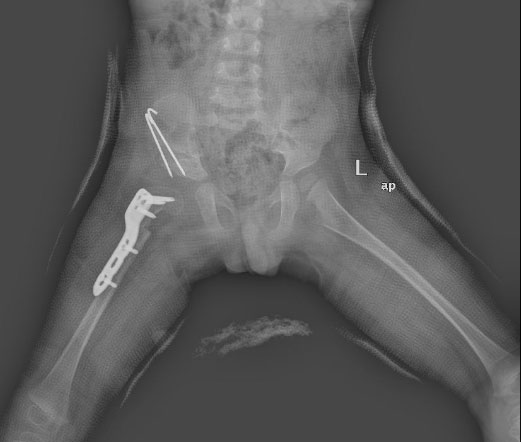 近期,玉溪市中醫(yī)醫(yī)院小兒骨科(骨傷三科)收治了一名低體重發(fā)育性髖關(guān)節(jié)脫位患兒。該患兒2歲零5月,體重僅10kg,為同齡低體重患兒。出生后三個(gè)月發(fā)現(xiàn)髖關(guān)節(jié)脫位,期間采用Pavlik挽具(吊帶)及(髖人字)石膏褲固定2次等治療均不能復(fù)位。