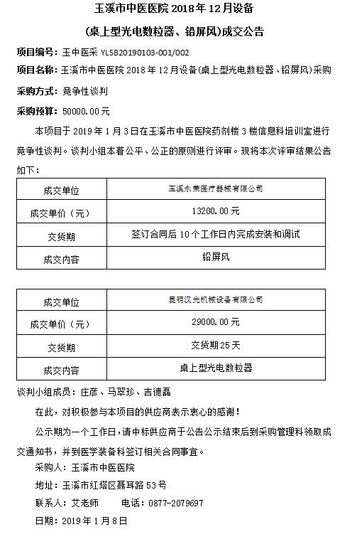 玉溪市中醫(yī)醫(yī)院2018年12月設(shè)備(桌上型光電數(shù)粒器、鉛屏風(fēng))成交公告