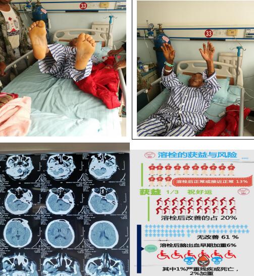 對(duì)缺血性卒中患者的治療最重要的一點(diǎn)就是早發(fā)現(xiàn),早治療,患者被確診為急性缺血性卒中,且在溶栓時(shí)間窗內(nèi),決定立即為患者進(jìn)行溶栓治療。鑒于該患者是勐??h中醫(yī)醫(yī)院首例溶栓病人,溶栓治療需要多一份謹(jǐn)慎,蔡亞梅醫(yī)師立即向我院腦病科沈躍玲主任匯報(bào)情況征詢意見。該院魏榮華副院長(zhǎng)也立即到科室內(nèi)參與救治,為患者開通所有綠色通道,急查床旁心電圖、血常規(guī)、血糖、凝血檢查快速回報(bào),患者各項(xiàng)指標(biāo)達(dá)到溶栓條件,無溶栓禁忌癥,經(jīng)綜合評(píng)估,告知利弊,充分與患者家屬溝通后,內(nèi)科醫(yī)護(hù)人員全力配合,立即為患者進(jìn)行了溶栓治療,當(dāng)班醫(yī)生、護(hù)士嚴(yán)密監(jiān)測(cè)病情,溶栓時(shí)和溶栓后患者病情平穩(wěn)。