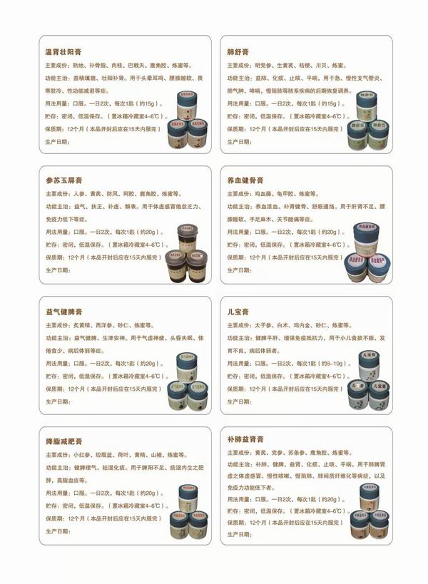 4、防病治?。横槍颊卟煌“Y開具的膏方確能防病治病,尤其對于康復(fù)期的腫瘤患者、易反復(fù)感冒免疫力低下的患者等,在冬令服食扶正膏滋藥,不僅能提高免疫功能,而且能在體內(nèi)貯存豐富的營養(yǎng)物質(zhì),有助于防復(fù)發(fā),抗轉(zhuǎn)移,防感冒,增強(qiáng)抵抗力。