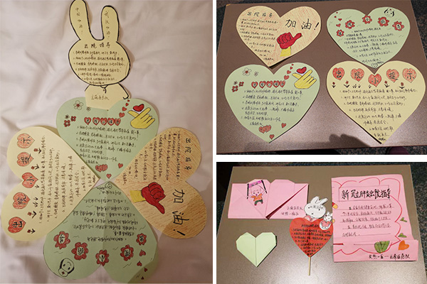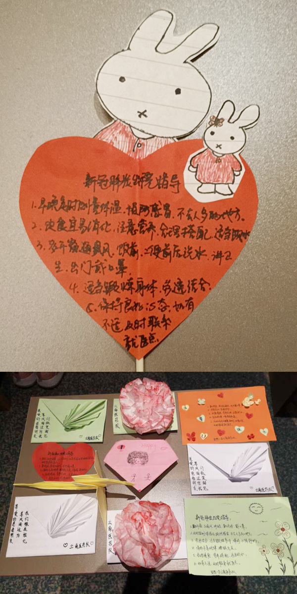 可是辦公室里只有一些A4紙和少量的彩色卡紙,以及黑色和紅色的筆,就連剪刀都是稀有物品。怎么辦?為了給出院患者送上一份別出心裁又“干貨滿滿”的出院指導(dǎo)小貼士,我們充分發(fā)揮想象力,下班后的晚上,大家各自在自己房間里開動腦筋,折紙鶴、折小花、剪心形、畫畫……有用棉簽當(dāng)小手棒的,有用抽紙折小花的,還有剪紙的。沒有膠水,我們用米飯當(dāng)膠水;沒有線,我們剪透明膠布當(dāng)線。在制作過程中,不僅傳遞了我們對患者的一份祝福和關(guān)愛,也用這樣一種特殊的方式緩解了白天護(hù)理工作的疲憊,仿佛是把我們?nèi)w隊員拉回了童年。
