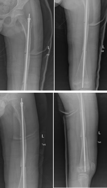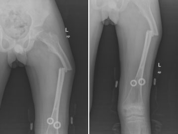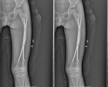 上圖為患者9歲時(shí)第2次股骨干骨折術(shù)后影像學(xué)資料