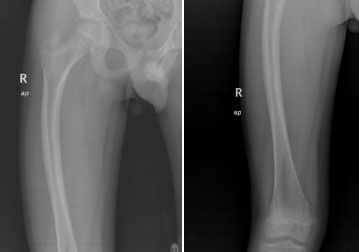 上圖為患者12歲時(shí)第3次股骨干骨折影像學(xué)資料
