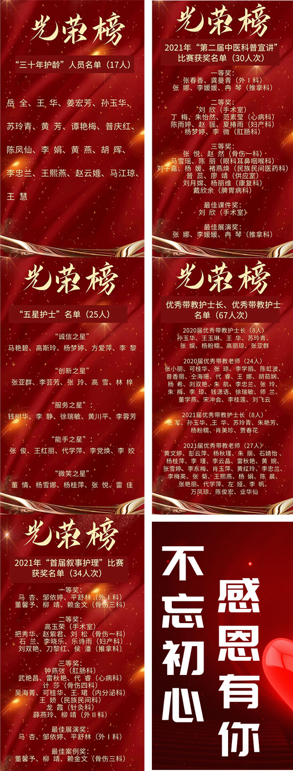 最后,院領(lǐng)導(dǎo)為“三十年護(hù)齡”護(hù)士、“五星”護(hù)士、2021年首屆敘事護(hù)理比賽獲獎(jiǎng)?wù)摺?021年第二屆中醫(yī)科普宣講比賽獲獎(jiǎng)?wù)摺?yōu)秀帶教護(hù)士長、優(yōu)秀帶教護(hù)士頒發(fā)了榮譽(yù)證書。骨傷一科護(hù)士長王華作為“三十年護(hù)齡”代表發(fā)表了感言,她對醫(yī)院給予的榮譽(yù)表示感謝,希望全院護(hù)士繼續(xù)追隨南丁格爾的足跡,認(rèn)真踐行誓言,無悔奉獻(xiàn)。