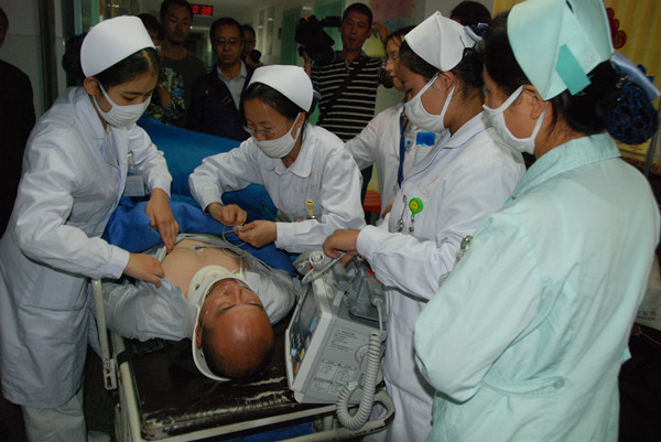 這次急救演練與前幾次不同的是,“患者”是由專家自行請來的“標(biāo)準(zhǔn)化病人”扮演,其曾經(jīng)多次扮演過這一角色,由專家親自扮演“患者”的家屬。當(dāng)晚8時許,“患者”在醫(yī)院突然摔倒,摔倒的位置不再是設(shè)置在急診科附近,而是設(shè)置在一個急救能力相對薄弱的治療科室的樓道口。路過的護(hù)士突遇這名昏迷的重傷“患者”后,急救的大幕就此拉開。很快,骨傷科、外科、急診科醫(yī)護(hù)人員紛紛趕來急救,患者在進(jìn)行了初步的急救處置和傷情判斷后,被擔(dān)架隊(duì)緊急送到CT室檢查,在得出CT的診斷結(jié)果后,“患者”被緊急送到重癥監(jiān)護(hù)室,這時候病房突然停電了,醫(yī)護(hù)人員采取應(yīng)急手段應(yīng)用手電和應(yīng)急燈的照明繼續(xù)進(jìn)行搶救,搶救過程中骨傷科、外科科室主任及時趕到現(xiàn)場參加會診?!盎颊摺痹跁\過后,發(fā)現(xiàn)傷情嚴(yán)重,緊接著被馬上送進(jìn)手術(shù)室。約一小時的急救過程,讓記者和在場的住院患者無不感到驚心動魄?,F(xiàn)場的醫(yī)護(hù)人員雖然一會兒就明白這是一場演練,但他們毫不松懈的“假戲真做”,將演練進(jìn)行到最后。