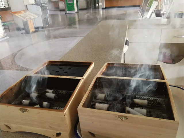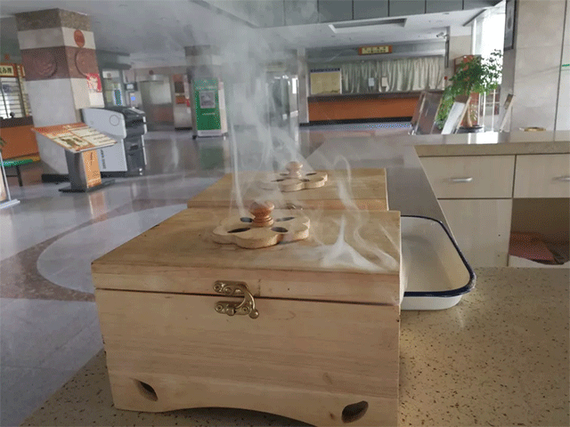 自1月30日起,為加強(qiáng)防控新型冠狀病毒感染的肺炎疫情,充分發(fā)揮中醫(yī)藥在防病治病中的作用,玉溪市中醫(yī)醫(yī)院分別在門診大廳和一號(hào)樓、二號(hào)樓、三號(hào)樓大廳設(shè)置熏艾盒,持續(xù)燃燒艾條和蒼術(shù),進(jìn)行空氣消毒。
