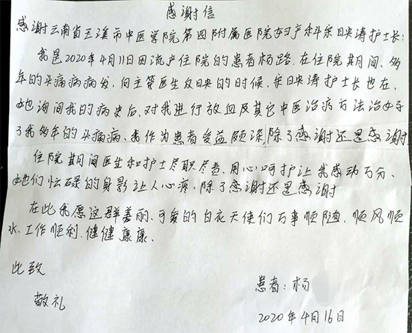 如果受孕是否會(huì)再次發(fā)生意外呢?慢性頭痛的痛苦如何才能得到緩解?楊女士承受著巨大的心理壓力。輾轉(zhuǎn)多處,聽(tīng)說(shuō)玉溪市中醫(yī)院醫(yī)院婦產(chǎn)科中醫(yī)治療效果好、副作用小,楊女士慕名而來(lái)就診。經(jīng)過(guò)婦產(chǎn)科護(hù)士長(zhǎng)辨證后,給楊女士進(jìn)行耳尖放血治療,通過(guò)規(guī)范科學(xué)的診療,楊女士多年的慢性頭痛被治愈了,擺脫了頭痛頑疾的她說(shuō)到:“想不到耳尖放血療法如此神奇,十多年的慢性頭痛就這樣治好了,我要是早點(diǎn)來(lái)這就診就好了。”出院后的楊女士給玉溪市中醫(yī)院醫(yī)院婦產(chǎn)科寫(xiě)來(lái)了感謝信,她現(xiàn)在不僅身體恢復(fù)了健康,也對(duì)未來(lái)的備孕之路充滿了信心。